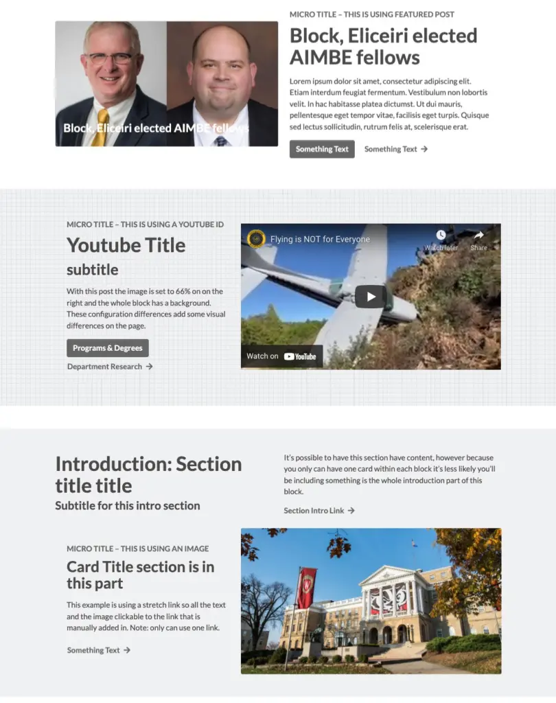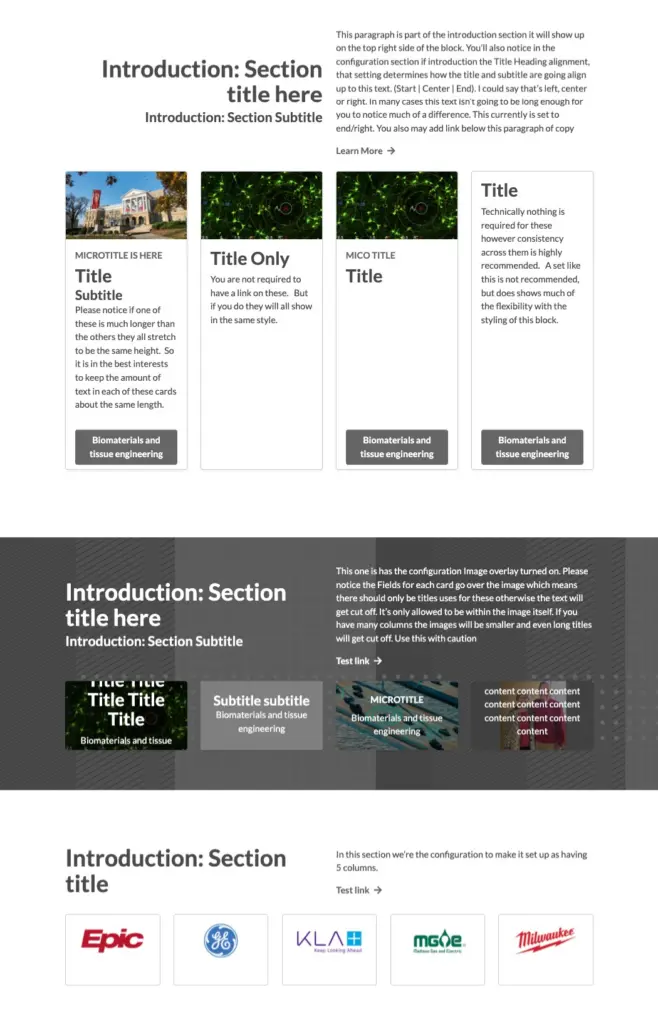 This block can be a bit deceiving the options can make it look quite a bit different. This has four sections for content and settings. (Introduction, Add/Edit Cards, Configuration and column structure). There are three different examples of how this block may be used.