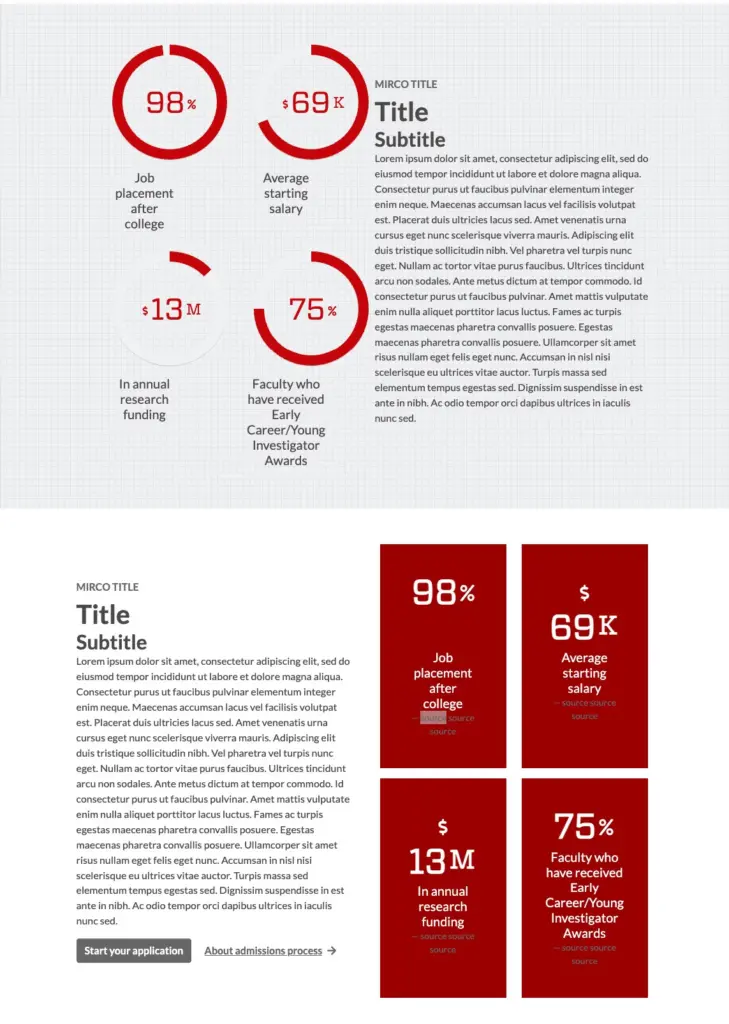 Statistics block has 2 primary variations, Statistics and Statistics Grid. Statistics is horizontal in design with 1-3 stats. Statistics Grid will stack the stats two wide, then repeat vertically.