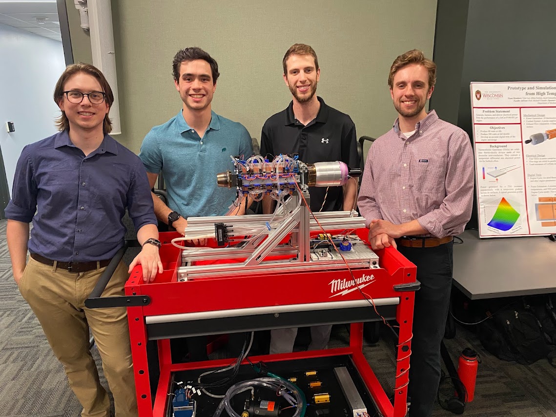 April 20, 2023 Bucky’s Flyboys Design Blasts Off Written By: Caitlin Scott Departments: Mechanical Engineering Categories: Students|Undergraduate One of the spring 2023 Mechanical Engineering Senior Design teams, Bucky’s Flyboys, recently took second place in the U.S. Air Force Research Laboratory’s annual Aerospace Propulsion Outreach Program (APOP) competition. The objectives of the competition were to modify a small gas turbine engine such that it could produce DC power while maximizing thrust to weight ratio. To accomplish this task the team utilized Thermoelectric Generators (TEG’s) to convert heat from the engine’s exhaust stream into DC power. The team traveled to Wright Patterson Air Force Base in Dayton, Ohio in mid-April to test their design with air force engineers. The design was able to generate 315 Watts at full throttle and 80 W at idle, garnering them second place out of 11 teams. While at the base they attended a poster presentation session where students could compare and discuss designs while also networking with Airforce Engineers. This was UW-Madison’s first year competing in the competition and the team is proud of their second-place finish compared to other universities who have been competing for many years! UW-Madison plans to continue participating in the APOP competition in future years and hopes to be a strong contender while providing students with an enriching design experience. Miles Perkins, Jake Schraufnagel, Mike Yee, and Tyler Lee with their design at the APOP poster presentation. The next Senior Design symposium event is coming up on May 4, 2023. Students will showcase the projects they’ve been working on for two semesters. Miles Perkins, Jake Schraufnagel, Mike Yee, Raymond Yang, Mitchell Erdman, Tyler Lee, Timmy Quakkelaar, and Konner Waszak-Cortessi at Wright Patterson Air Force Base.