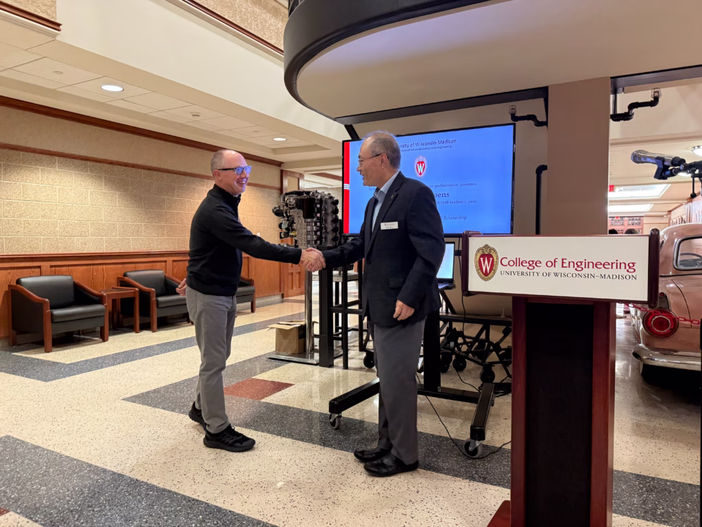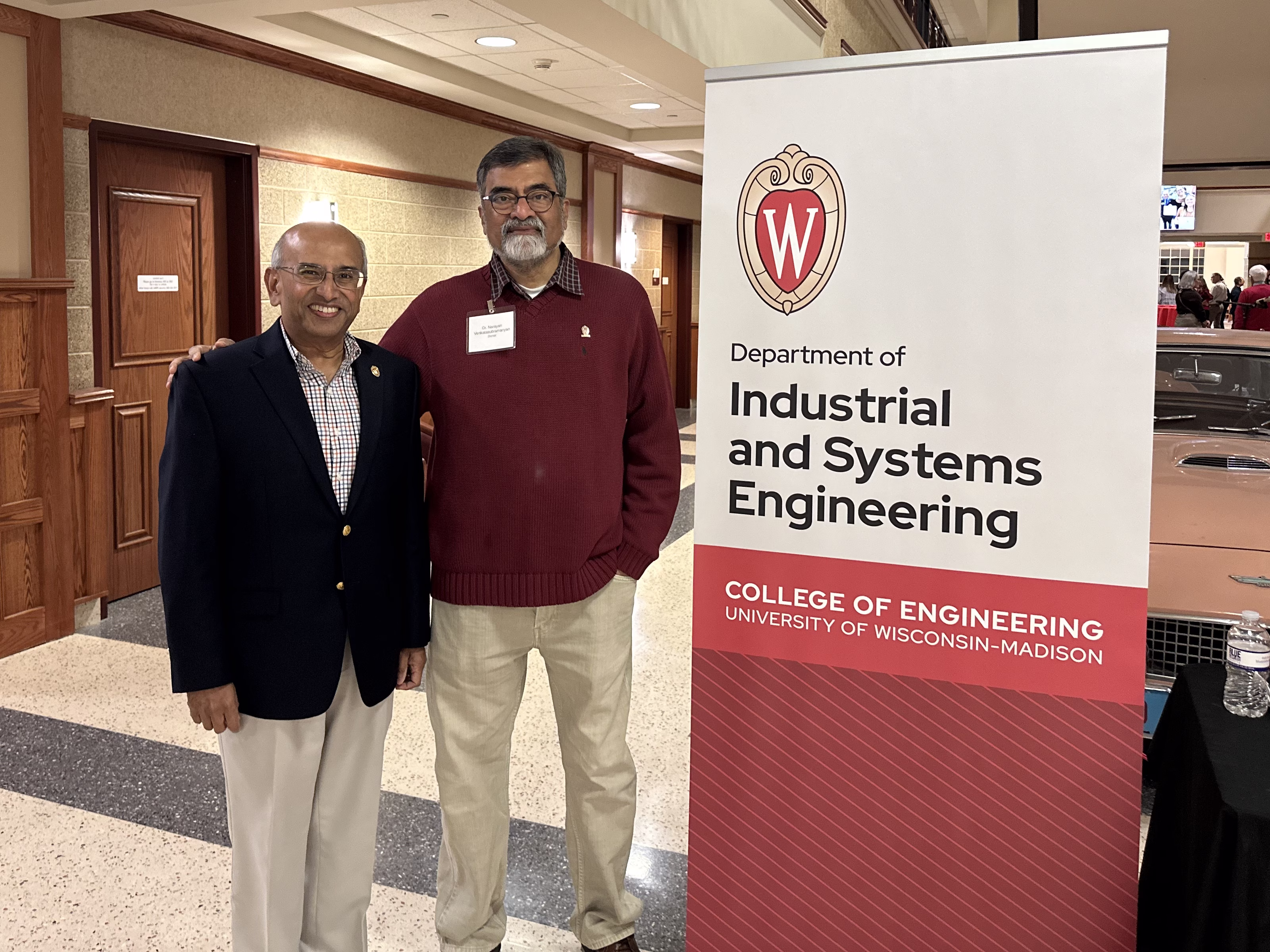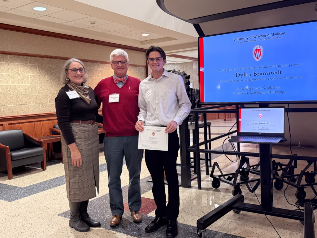 November 12, 2025 ISyE Scholarship Reception: Celebrating Success Written By: Casandra Zimmerman Departments: Industrial & Systems Engineering Categories: Alumni|Awards|Students The University of Wisconsin-Madison’s Department of Industrial and Systems Engineering (ISyE)celebrated its annual Scholarship Reception on November 06, 2025. This year’s event brought together scholarship recipients, faculty, and alumni donors for an evening dedicated to honoring academic achievement and a show of gratitude for the support that makes these scholarships possible. Family and friends of the scholarship recipients also joined. Jeff and Diane Roznowski and Dylan Bramstedt Ed Nawrocki and ISyE Chair Shiyu Zhou This year, 139 students received a total of $317,125 in scholarships, ensuring that these talented individuals can focus on their studies and research. Department Chair Dr. Shiyu Zhou welcomed attendees with remarks emphasizing the critical role of these scholarships in shaping the future of the department and the industrial and systems engineering field. The reception was highlighted by the attendance of several key alumni, donors, and a late donor’s family, including Jeff Roznowski, Dr. Narayan Venkatasubramanyan, Sari and Yehuda Karsh (family of the late Professor Ben-Tzion Karsh, namesake of the graduate scholarship in his honor), and Ed Nawrocki. These individuals have made significant contributions, providing both financial support and strategic guidance over the years. Their continued involvement remains a vital part of the department’s growth and success. Through the generosity of alumni and donors, the UW-ISyE scholarship program directly supports our core mission of providing world-class education and cultivating future engineering leaders! ISyE Prof. Raj Veeramani and Dr. Narayan Venkatasubramanyan