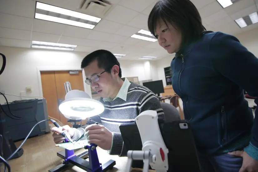 November 14, 2016 Liquid silicon: Multi-duty computer chips could bridge the gap between computation and storage Written By: Sam Million-Weaver Departments: Electrical & Computer Engineering Categories: Awards Revolutionary computer chips in development at the University of Wisconsin-Madison could make future computers much more efficient and powerful. With funding from a Defense Advanced Research Projects Agency (DARPA) young investigator award, Jing Li, an assistant professor of electrical and computer engineering at UW-Madison, is creating fully morphable computer chips that can be configured to perform complex calculations, store massive amounts of information within the same integrated unit and perform efficient communication across units. Jing Li She has named the new chips “Liquid Silicon.” “Liquid means software and silicon means hardware. It is a collaborative software/hardware technique,” says Li. “You can have a supercomputer in a box if you want. We want to target a lot of very interesting and data-intensive applications, including facial or voice recognition, natural language processing, and graph analytics.” The chips will pack a powerful computational punch, while being able to store significant amounts of data—tasks that require two entirely different types of hardware in modern computers. That separation makes our machines less efficient. “There’s a huge bottleneck when classical computers need to move data between memory and processor,” says Li. “We’re building a unified hardware that can bridge the gap between computation and storage.” Right now, processor and memory chips are separately produced by different manufacturing foundries owned by different industries. Then, they are assembled together by system engineers on printed circuit boards to make computers and smartphones. The wide separation between computation and storage means that even simple operations, like searches, require multiple steps to accomplish: first fetching data from the memory, then sending that data all the way through the deep storage hierarchy to the processor core. The chips that Li is developing, by contrast, incorporate memory, computation and communication into the same device using monolithic 3D integration: silicon CMOS circuitry on the bottom connected with solid-state memory arrays on the top using dense metal-to-metal links. End users will be able to configure the devices to allocate more or fewer resources to memory or computation, depending on what types of applications a system needs to run. Using a top-of-the-line probing station combined with their home-built testing platform gives Jing Li and her students greater flexibility to test the new chips than any devices used in industry. Photo: Stephanie Precourt “It can be dynamic and flexible,” says Li. “We originally worried it might be too hard to use because there are too many options. But with proper optimization, anyone can take advantage of the rich flexibility offered by our hardware.” To help people harness the new chip’s potential, Li’s group also is developing software that translates popular programming languages into the chip’s machine code, a process called compilation. “If I just handed you something and said, ‘This is a supercomputer in a box,’ you might not be able to use it if the programming interface is too difficult,” says Li. “You cannot imagine people programming in terms of binary zeroes and ones. It would be too painful.” Thanks to her compilation software, programmers will be able to port their applications directly onto this new type of hardware without changing their coding habits. To evaluate the performance of prototype liquid silicon chips, Li and her students established an automated testing system they built from scratch. The platform is so versatile that it can reveal reliability problems that even the most advanced industry testing setup typically cannot observe. That’s also why multiple companies recently have sent chips to Li for evaluation. Given that testing accounts for more than half the consumer cost of computer chips, having such advanced infrastructure at UW-Madison will not only help make liquid silicon chips a reality, but also facilitate future research. “We can do all types of device-level, circuit-level and system-level testing with our platform,” says Li. “Our industry partners told us that our testing system does the entire job of a test engineer automatically.” Li is the first computational researcher at UW-Madison ever to receive a DARPA Young Faculty Award. In 2016, she joins 25 other young faculty award recipients nationwide whose research topics range from gene therapy to machine learning. The grant guarantees $500,000 of support for two years.