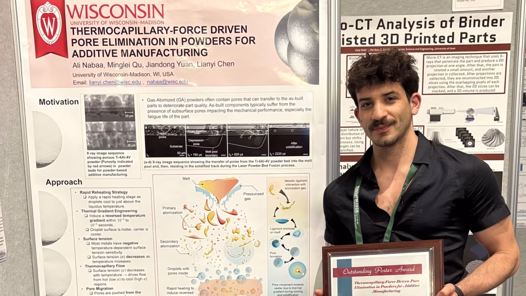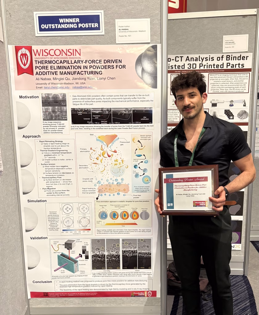 July 1, 2025 PhD student wins Metal Powder Industries Federation outstanding poster Written By: Caitlin Scott Departments: Mechanical Engineering Categories: Graduate|Research PhD student Ali Nabaa with his winning poster. Ali Nabaa, PhD student in the lab of Kuo K. & Cindy F. Wang Associate Professor Lianyi Chen, recently won the Outstanding Poster award from the Metal Powder Industries Federation at the PowderMet2025/AMPM2025 conference. Only one poster was selected for this award. The posters are reviewed and judged based on technical, scientific, and professional integrity; presentation clarity and overall esthetic appearance and whether they enhance practical or industrial value for the industry. The technology shown in the poster is patented by the Wisconsin Alumni Research Foundation (WARF). Nabaa’s research interests lie within the intersection of manufacturing, fluid flow, machine learning and in-situ monitoring. View the winning poster here.