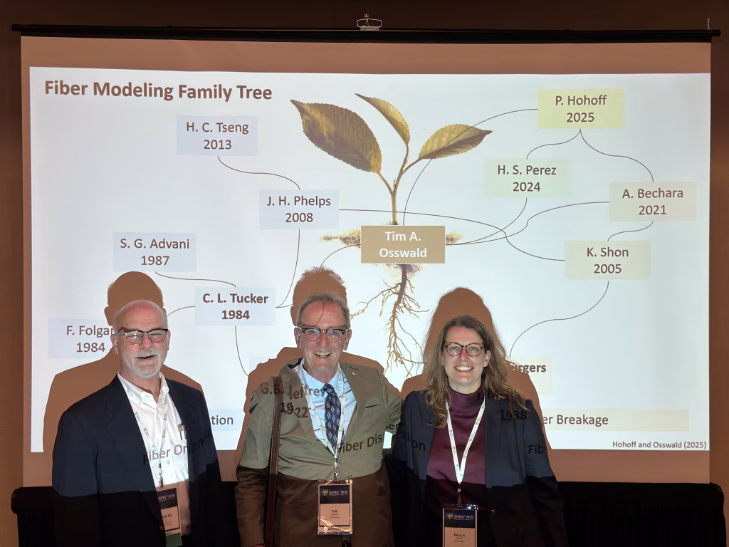 August 27, 2025 Student Spotlight: Mechanical Engineering PhD, Paula Hohoff Written By: Kassi Akers Departments: Mechanical Engineering Categories: Graduate|Students The journey to a PhD is never easy, but for Paula Hohoff, the path has been bonded together by one thing: polymers. Entering the final year of her Mechanical Engineering PhD program, Paula has found great success not only in research, but also in mentorship and building a strong sense of community. Whether connecting with colleagues in the field at a conference or drawing parallels between her passions for plastics and sailing, Paula brings energy and curiosity to everything she does. Her passion for polymers isn’t just academic – it’s a lens through which she sees the world. So far, UW-Madison has been a great playground, both academically and personally, to pursue her career goals and follow her dreams. What has your engineering journey been like? Can you describe your educational path prior to pursuing a graduate degree? As a child I was already curious to understand how things work, especially technical applications. My childhood dream was to become a helicopter pilot for medical and search-and-rescue operations, but due to medical reasons I had to find an alternative career path. Mechanical engineering seemed to cover many topics that were interesting to me, so I started my undergrad at RWTH Aachen University in Germany and it turned out I found a lot of joy in this field of study: very fundamental understanding of very practical problems. Alongside my studies, I had student jobs and internships in engineering that drew my interest to plastics processing and engineering, which is why I added a master’s degree with a focus in Materials (mainly Polymer Engineering) and Modeling & Simulation. During my master’s I spent a semester at Tallinn University of Technology in Estonia, in which I found friends from all over Europe and had the chance to focus on the fundamentals of polymer science. Why did you decide to attend UW-Madison? What about the university or ME department stand out to you from other institutions? Simply put: because of Prof. Tim Osswald! I began working in his lab during my master’s thesis, and he later encouraged me to pursue a PhD under his supervision, recognizing my background and skills aligned well with the lab’s focus. Moreover, UW-Madison is a great land-grant university with excellent opportunities to grow: outstanding research, a collaborative environment, the right size, and a strong sense of purpose through the Wisconsin Idea. There’s no place like Madison. Can you talk about your research and the work you’re doing with the Polymer Engineering Center? My work at the Polymer Engineering Center (PEC) has included my main PhD research topic about the process-induced microstructure in long fiber-reinforced thermoplastics. I investigate how fibers break and disperse during plasticization, and I create mathematical models so that my findings can be implemented into commercial software, calculating the performance of parts made from long fiber-reinforced plastics. Apart from that, I am also glad that I have had the chance to contribute to other research projects. One of those included a big recycling study in which we determined how the properties of plastics change throughout multiple cycles of recycling. In another project, we predicted the flow behavior of thermoset material during compression molding using simulation tools and material modeling. Working on different projects makes me learn a lot from fundamentals to applications and how to utilize the knowledge I gained to optimize processes and draw conclusions for future innovations. I enjoy working with different students and collaborators who bring a variety of knowledge and perspectives, there is always something to learn and to share. A photo from the Annual Technical Conference (ANTEC) of the Society of Plastics Engineers (SPE) with Prof. Charles L. Tucker, III (Paula’s ‘academic grandfather’) (left) and Prof. Tim A. Osswald (her ‘academic father’) (middle). What opportunities, if any, have been presented to you because of the work you’re doing? I have had the chance to attend many conferences to present my work and connect with academia and industry alike, e.g. with the Society of Plastics Engineers (SPE) or the Polymer Processing Society (PPS). Discussing my work and getting feedback from professionals in industry and academia has kept my work fundamental but applicable, which has been a big contributor to its success. I have received awards and scholarships for my work, had the chance to visit manufacturing plants and research labs, start collaborations, and learn a lot from other fields related to my studies. I recently was invited to participate in a workshop at MIT for Rising Stars in Mechanical Engineering to further grow my network and keep my research innovative and impactful. Are you involved in any student organizations or community groups? If so, which ones and what is your involvement? Involvement in the local college and community has been a big and important part of my graduate school experience and I am happy to share some of those here. In the Department of Mechanical Engineering, I have been involved with the Graduate Women in Mechanical Engineering Group in which we organize lunch-and-learns to build a strong network and get input for personal and professional development. I am also involved with different groups in the local community, one of which is the UW-Madison Hoofers Sailing Club (second-largest inland sailing club in the US!), in which I am a volunteer sailing instructor and help with outreach events. We are currently organizing an event about microplastics in global waters and invited a sailor who is doing research in this field. I am excited for this opportunity to bring my academic knowledge into the local community and share some insights to drive change for a better future. Paula