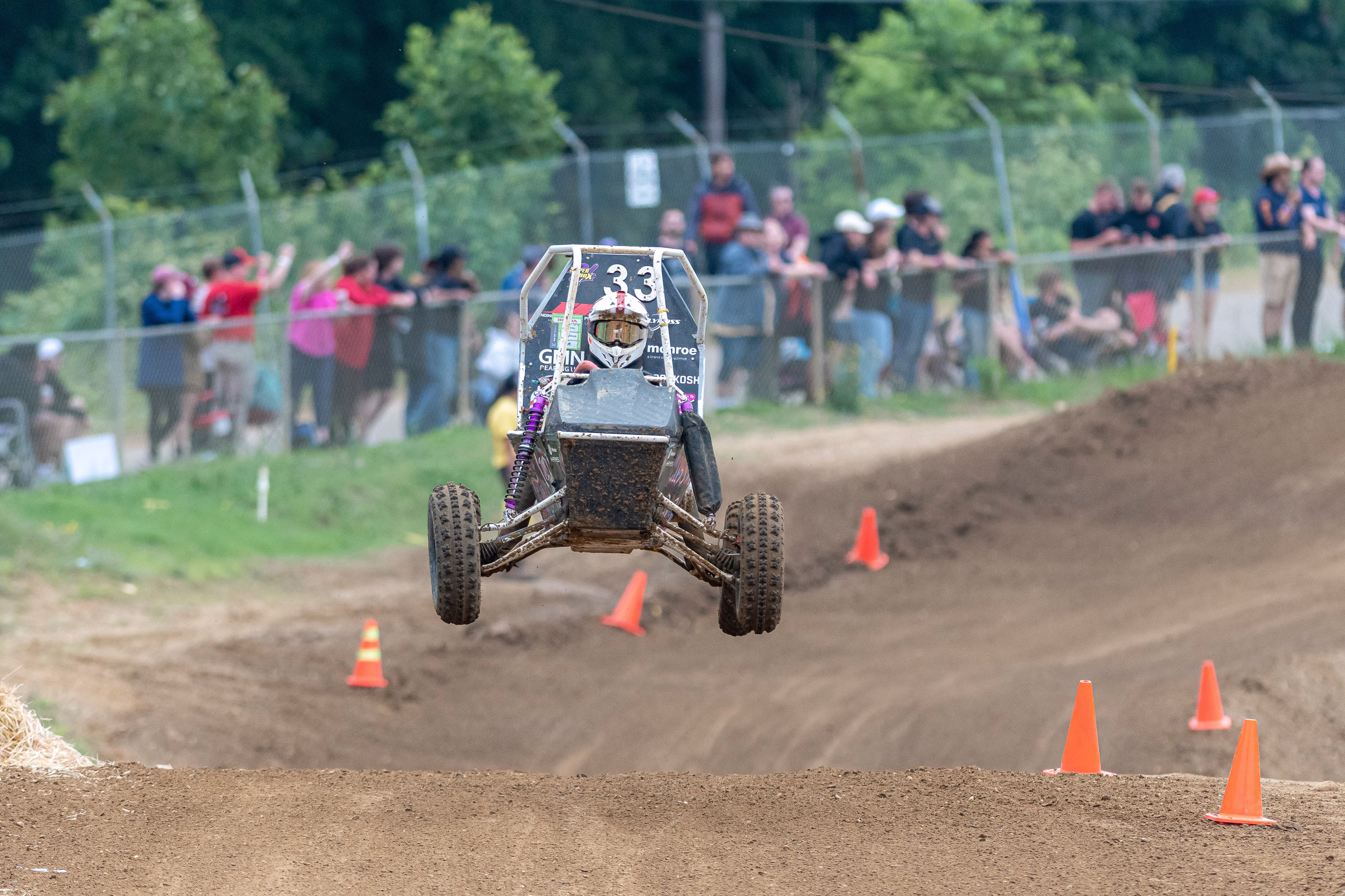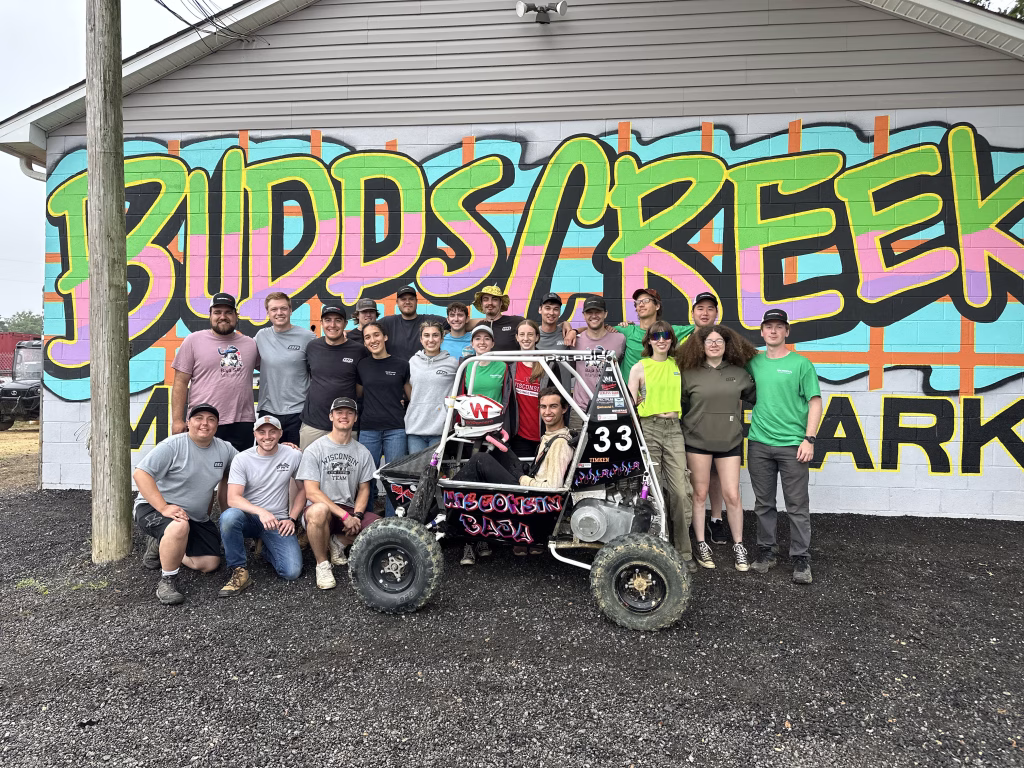 July 7, 2025 Wisconsin Baja Racing 2025 SAE Competition Written By: Kassi Akers Departments: Mechanical Engineering Categories: Students|Undergraduate Wisconsin Baja Racing placed 7th overall, out of 107 teams, in the Baja SAE Competition in Mechanicsville, Maryland in June. With teams from all over the world, the off-road motorsport team is proud of their placement and all the progress they made this past year. According to Cale Kubisiak, the club’s president and Mechanical Engineering B.S. Spring 2025 graduate, the team set out with a goal of doing better in the maneuverability category by being able to disconnect the belt drive to the front wheels. Not only did they achieve this goal, but they placed 16th in the maneuverability category, up from their 27th placement one year ago. Other highlights/results from the competition include: Level of preparedness for the technical inspection, as well as the design presentation Efficiently replacing a suspension arm that broke during the 4-hour endurance race to get the car back out on the track Skilled driving by their experience driver who navigated the track’s jumps and obstacles and passed other teams to end the race in 8th place Receiving:6th place in Suspension and Traction17th in Hill Climb15th in Acceleration18th in Design 13th in Cost Hear more about the team’s dynamic experience on their LinkedIn page. Featured image: Full team with car at SAE competition 2025. Thank you to Cale Kubisiak for sharing about the team’s experience and Georgia Tech Alum, Nick Pizzolato, for providing the action shots.