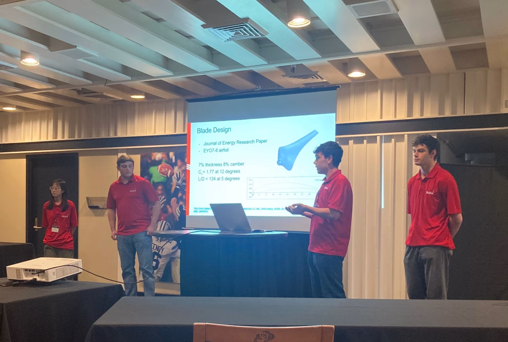 June 23, 2025 WiscWind participates in Collegiate Wind Competition 2025 Written By: Kassi Akers Departments: Civil & Environmental Engineering|Electrical & Computer Engineering|Mechanical Engineering Categories: Students|Undergraduate Collegiate Wind Competition 2025 competition team photo. After a year of design iterations, brainstorming sessions, and wind tunnel tests, UW-Madison’s WiscWind competition team wrapped up their year at the Collegiate Wind Competition in Boulder, Colorado. Although the team didn’t place, they walked away with something just as valuable – real-world experience in sustainable energy design and a renewed passion for innovation. The competition team is made up of Badgers from across the College of Engineering and beyond. Each student participant brings skills and knowledge from their degrees and experiences to contribute to the club’s goals. Whether it was mechanical and electrical engineering students collaborating to build a wind turbine, or civil, environmental, and chemical engineering students leading the design of a hypothetical offshore wind farm, all members played a vital role in preparing and competing in this national competition. With assistance from their faculty advisor, Scott Williams, the team developed a wind turbine from scratch with every component of their design, aside from bearings, screws, and some electrical equipment, designed or manufactured by a WiscWind member. Their structure has a homemade three phase axial flux generator with a PCB stator, a 3D printed pitch control, among other components developed in the design lab. At the competition, the team presented their design for industry professionals and other collegiate teams. They also participated in three sub competitions: turbine design and testing, project development, and connection creation. All of these components allowed the group to reflect on their own design and how they can make improvements in future years. Mark Kuzel, WiscWind team lead, remarked, “Talking with other teams and discussing the design process can bring up insights that our team may have overlooked or confirm ideas that we have been using. While everyone is competitive, they’re also willing to share ideas. One of the main goals of the competition is to win, but also for us to become better engineers.” With this goal in mind, WiscWind is already reflecting on what they want to improve for next year. Themes include, reducing mechanical losses, increasing blade efficiency, and focusing on generator design. Taking their wind turbine to the national competition, inspired new ideas and sparked excitement in the group. They plan to test early and often come fall, to see how many more watts they can squeeze out of their turbine in hopes of being a competitive threat at next year’s competition. Assembling the wind turbine before testing begins. Describing blade design during the presentation with industry professionals. Testing the wind turbine in the wind tunnel! Special thank you to Mark Kuzel and Scott Williams for sharing photos, testimonies, and competition details.