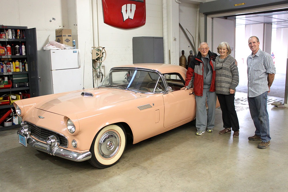 John Bollinger celebrated his graduation from UW-Madison by purchasing a new 1956 Ford Thunderbird. He and his wife, Heidi, donated it to the university. It’s displayed in the Mechanical Engineering Building as a symbol of the dean emeritus’ leadership, vision and imagination. The students and staff in the Student Automotive Center, advised by faculty associate Glenn Bower (right), maintained the vehicle as part of their educational experience.