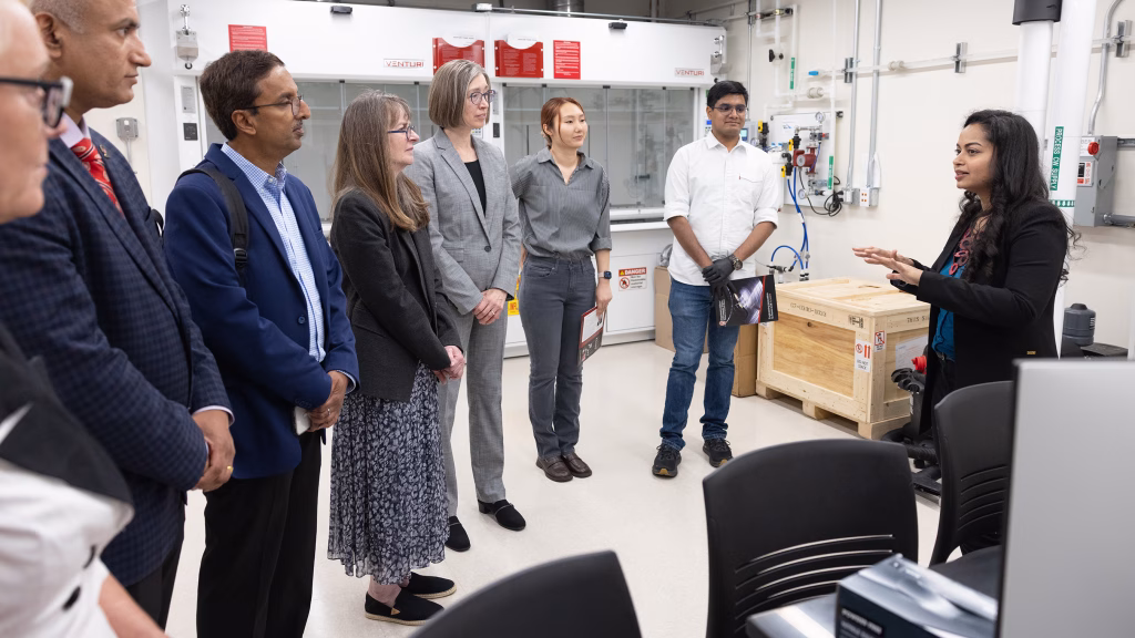 Among university and national R&D leaders at the lab’s grand opening were UW-Madison’s vice chancellor for research, Dorota Grejner-Brzezinska; College of Engineering Dean Devesh Ranjan; and Vivek Prasad, vice president for design engineering ecosystem enablement at NatCast, a nonprofit that operates the National Semiconductor Technology Center. They joined Susan Hagness, chair of the Department of Electrical and Computer Engineering and ECE Assistant Professor Shubhra Pasayat, who oversees the new facility as the lab’s principal investigator.
