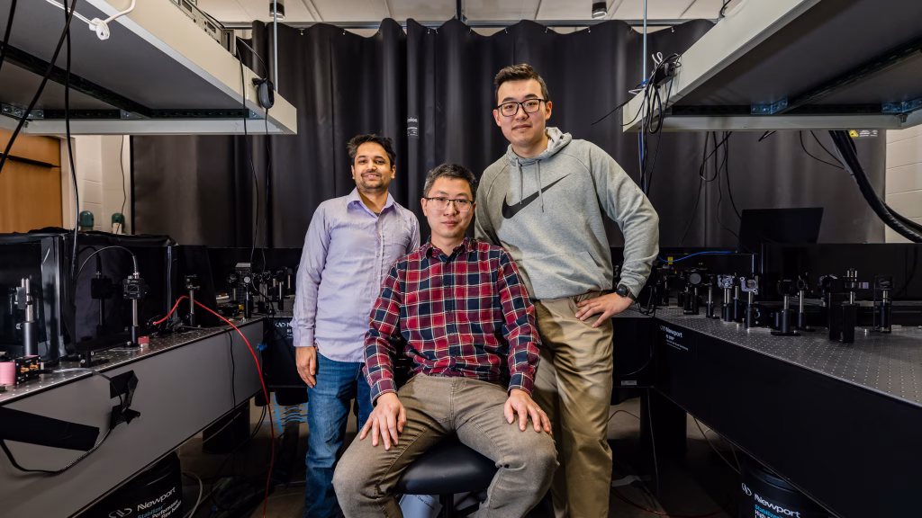 Postdoctoral scholar Sujan Subedi (left), Assistant Professor Jun Xiao and PhD student Tairan Xi are working on materials that utilize the terahertz band, which could lead to new biosensors, faster communications and other applications. Photos: Joel Hallberg