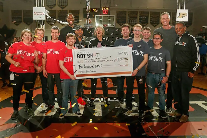 Students from the University of Wisconsin-Madison and from South Dakota State University earned the title of Land O’Lakes Bot Shot Champions April 7, 2019, beating out collegiate robotics teams from around the country in the basketball game H-O-R-S-E at a championship event in Minneapolis.