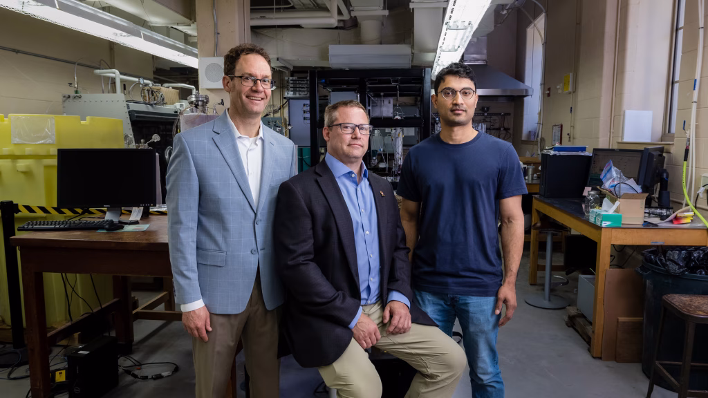 The research team, from left: Professor Scott Sanders, Professor Mark Anderson and graduate student Jojo Jacob. Credit: Joel Hallberg.